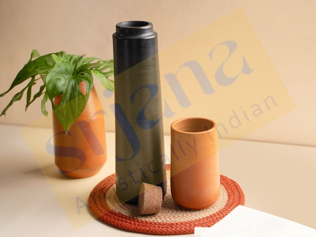 Experience the natural way of drinking water with this handcrafted terracotta black bottle and tumbler...