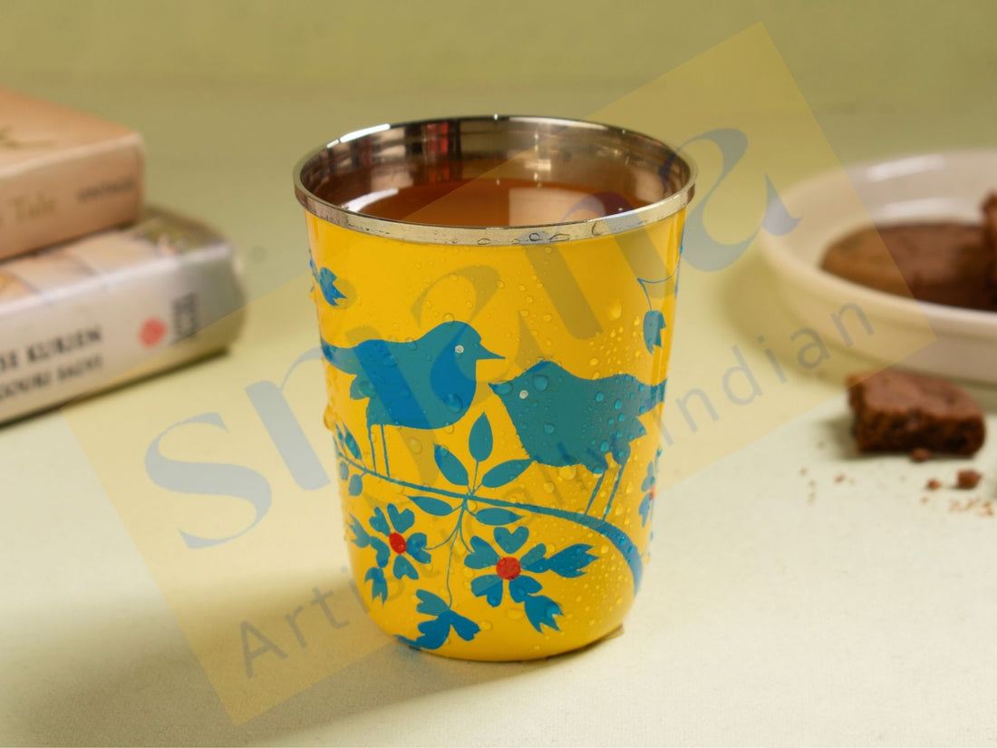 Brighten up your table with this vibrant hand-painted steel glass, featuring charming bird and floral...