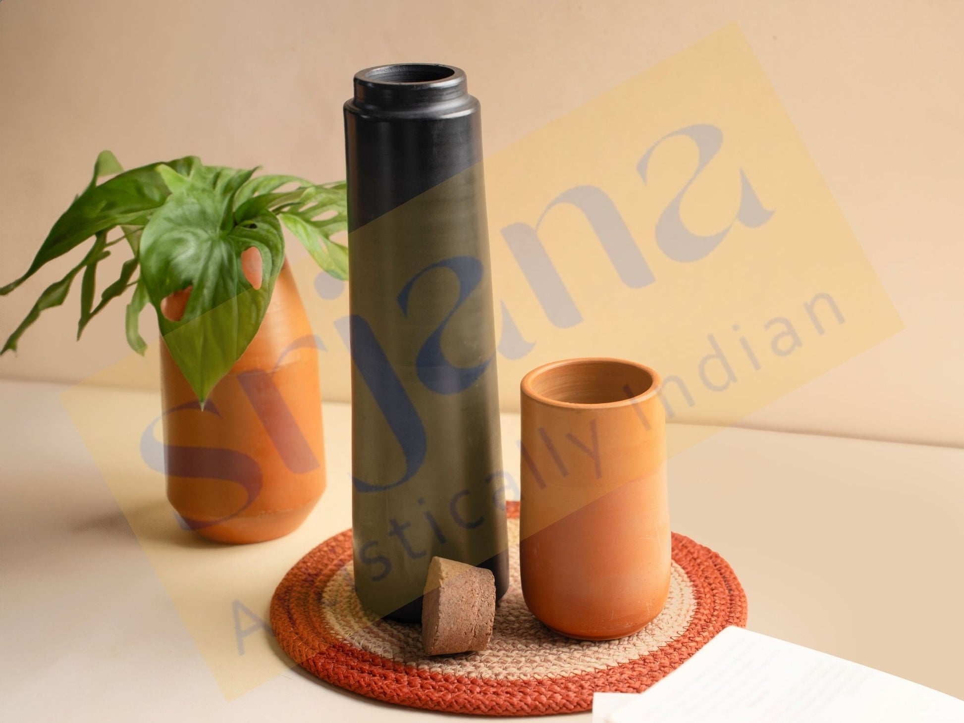 Experience the natural way of drinking water with this handcrafted terracotta black bottle and tumbler set, designed to enhance both aesthetics and functionality. Made using traditional pottery techniques, this eco-friendly set keeps your water naturally cool, promoting better hydration and a chemical-free lifestyle.